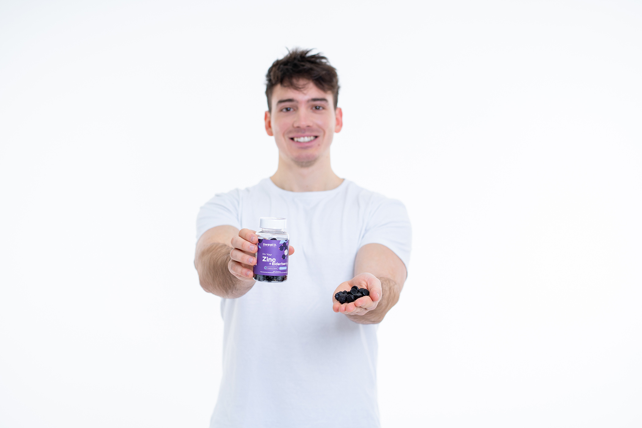 Zloženie: glukózový sirup, cukor, voda, kyselina askorbová (vitamín C), extrakt z bazyčiernej (Sambucus nigra), pektín (želírujúca látka), koncentrát z čiernej mrkvy (farbivo), kyselina citrónová a mliečna, citrát sodný (regulátor kyslosti), citrát zinočnatý (zinok), prírodná aróma, rastlinný (palmový) olej, karnaubský vosk (povlak).
